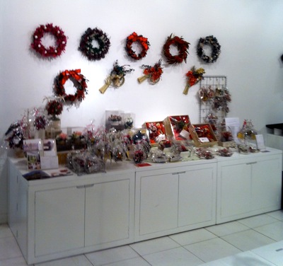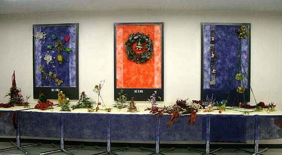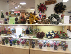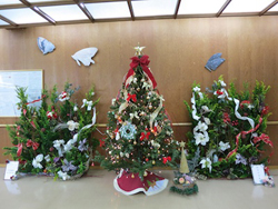 渡り廊下の壁面スペースをつかったかなり横幅の長いディスプレイでしたが、シックで香り高いクリスマスが表現できたのではないかと思います。佐藤さんをはじめとしてカウンセルシュガーの生徒さんが協力してつくりあげました。