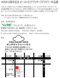 10周年記念作品展が3月3日(土)に無事に終了しました。 大変多くの方々にご来場いただきました。心より感謝申し上げると共に、すでに2012年の4月より13年目がスタートしました。これからも張り切って進んで行こうと思います。その作品展と、4月に出展したイベントのご報告をします。 ・VERDE10周年記念作品展
