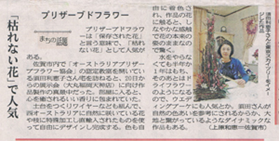 ■山崎美穂さん(AK) 名古屋で展示販売 理事認定教室の山崎美穂さんが、名古屋のギャラリー「アールグリシーヌ」で6月17日〜25日展示販売会を開催しました。 2つの異なるイメージを持った空間での展示は、オーストラリアプリザーブドフラワーの表情を多面的に見せることが出来たと思います。