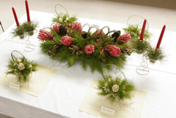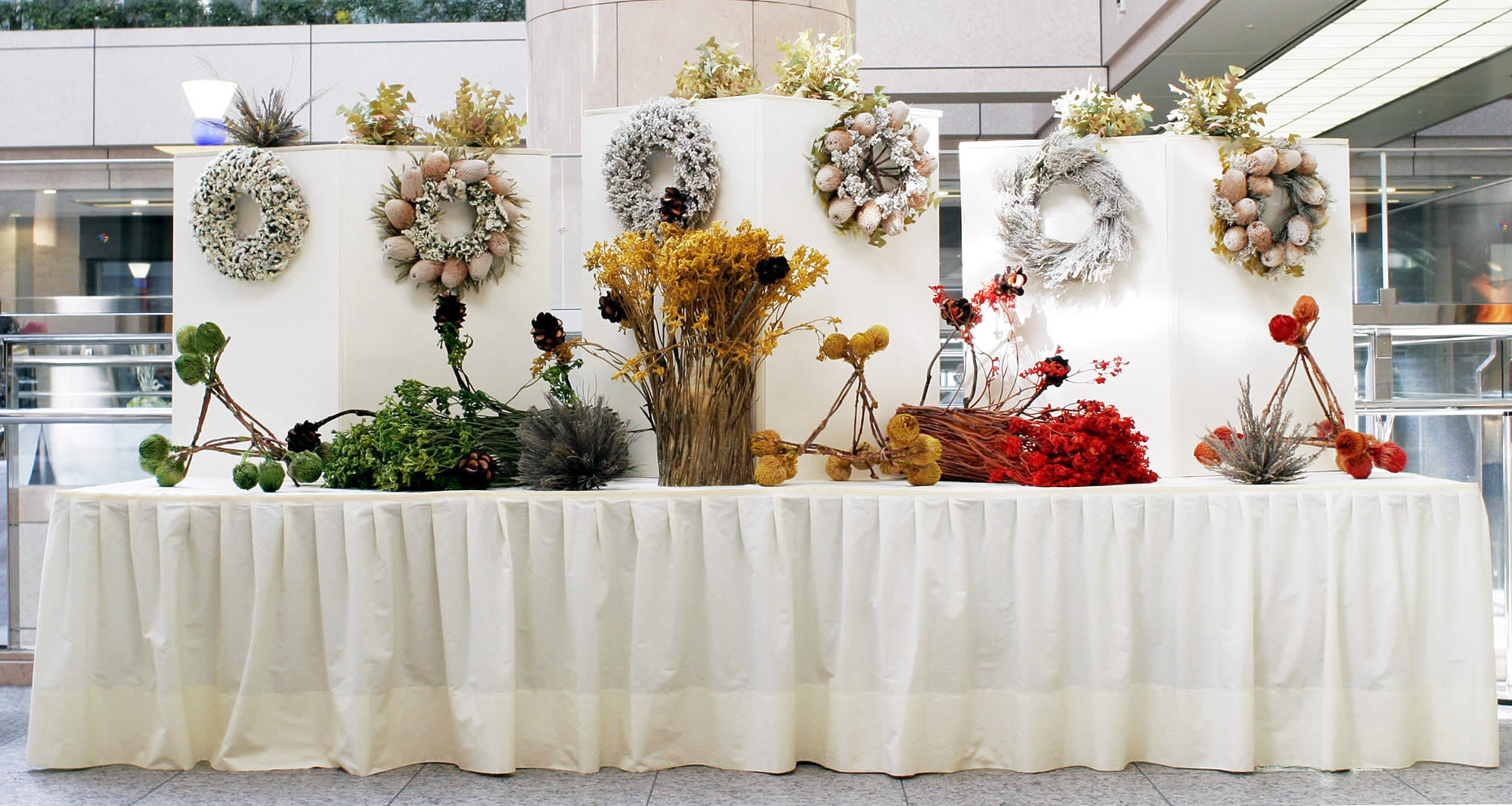 大きなテーブル3台と壁面を使った展示と販売です。中央のテーブルには、ダイニングのテーブルセッティングをして、オーストラリアプリザーブフラワーでお食事のシーンをつくりあげました。