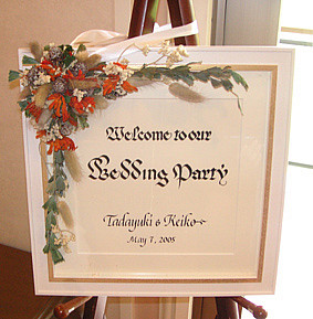 ふたつ目は、ウエルカムボード装花です。新婦のご希望の色味を選んで、ワイルドフラワーながらもクラシックなイメージにしあがりました。